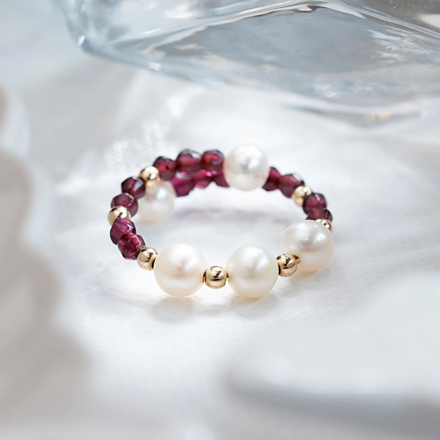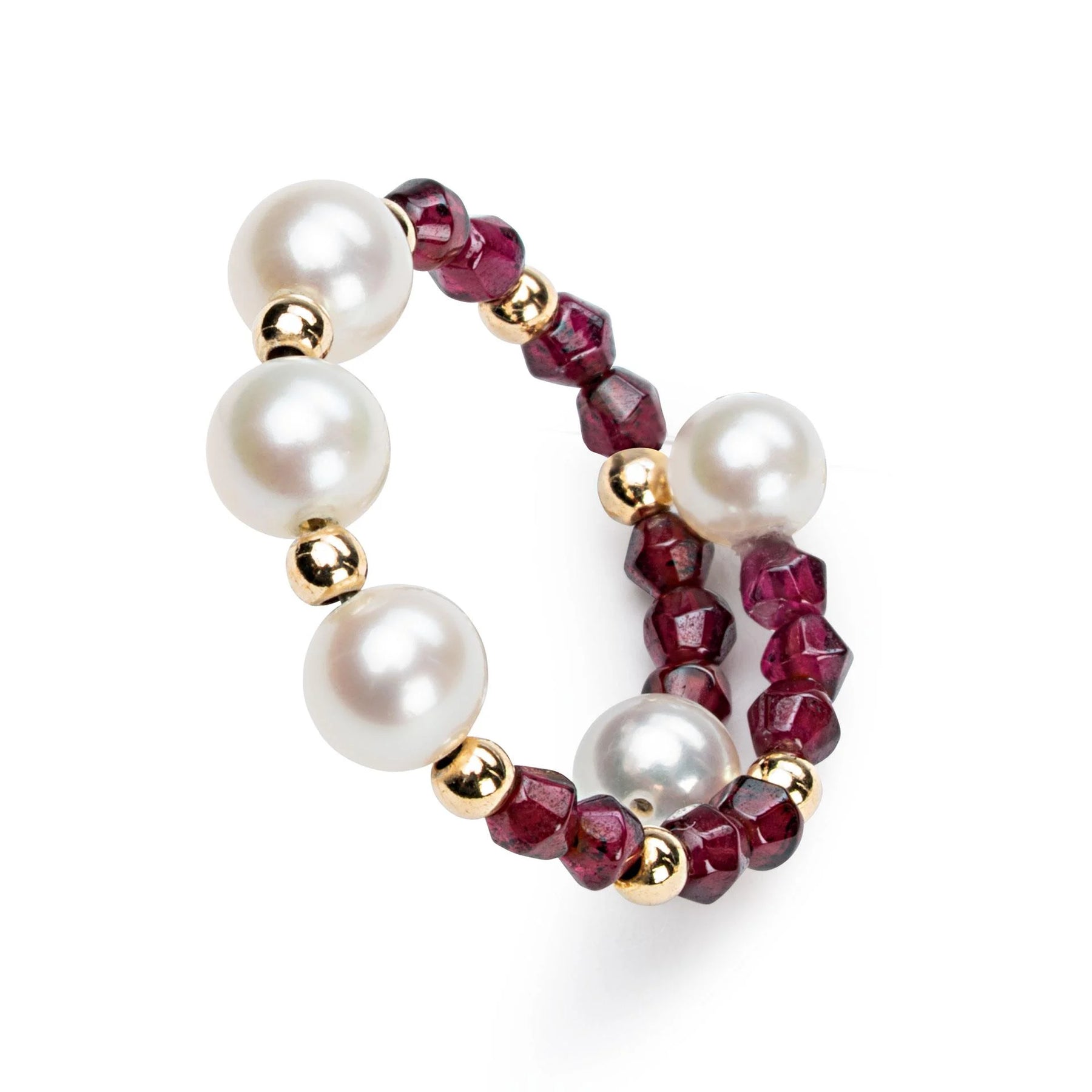 Klassisch und markant – dieser Fingerring verbindet den sanften Schimmer von Perlen mit der tiefroten Intensität facettierter Granatsteine. Die weissen Perlen harmonieren perfekt mit den edlen, dunkelroten Edelsteinperlen, während vergoldete Elemente den luxuriösen Gesamteindruck unterstreichen. Die facettierten Granate fangen das Licht ein und setzen einen kräftigen Farbakzent, der jedem Outfit Charakter verleiht. Dank elastischer Fassung trägt sich der Ring angenehm und passt sich flexibel verschiedenen Fingergrössen an – praktisch, wenn du ein Geschenk auswählst, ohne die genaue Ringgrösse zu kennen. Ob für dich selbst oder als besondere Aufmerksamkeit – dieses Schmuckstück steht für zeitlose Eleganz. Grösse der weissen Perlen ca. Ø 5 mm.