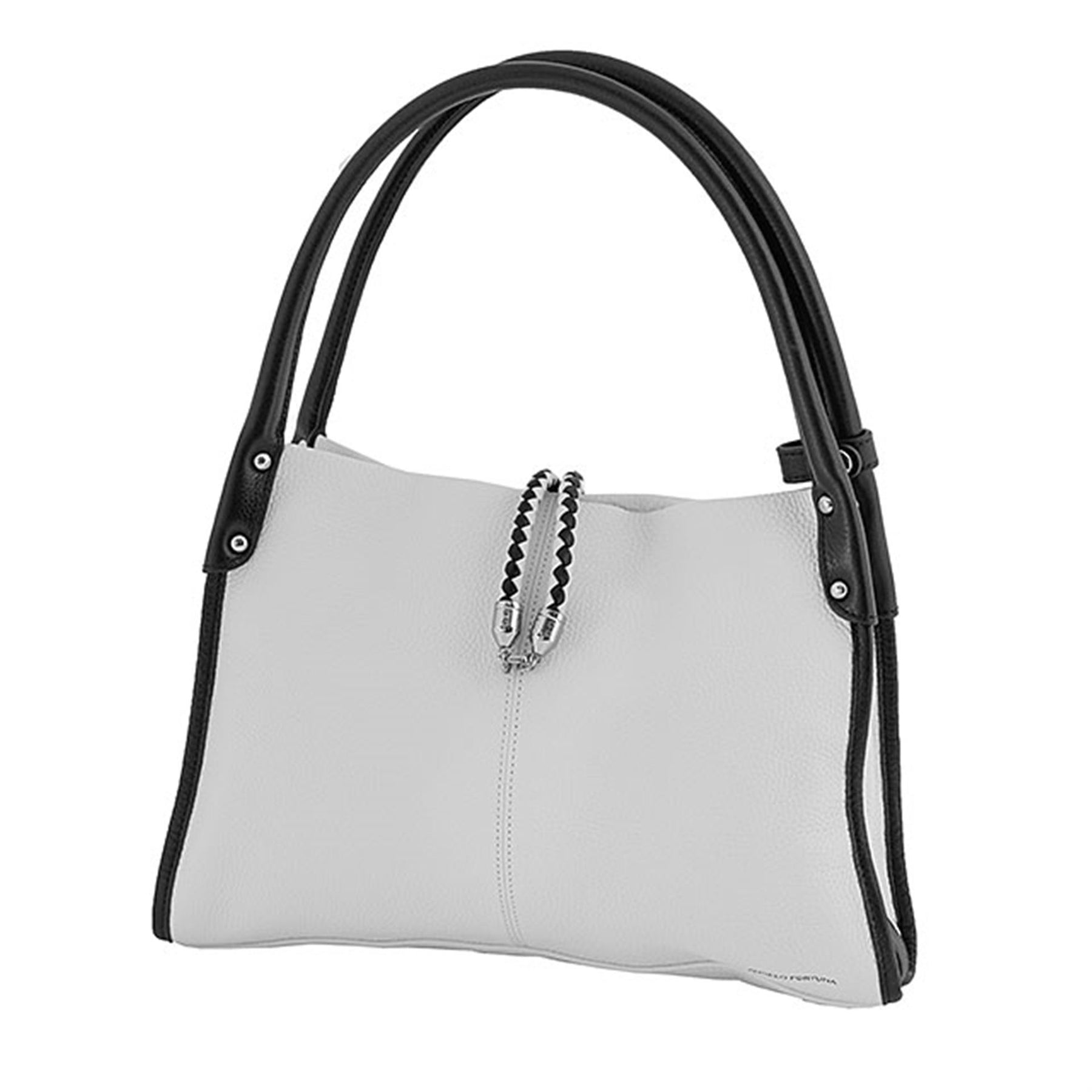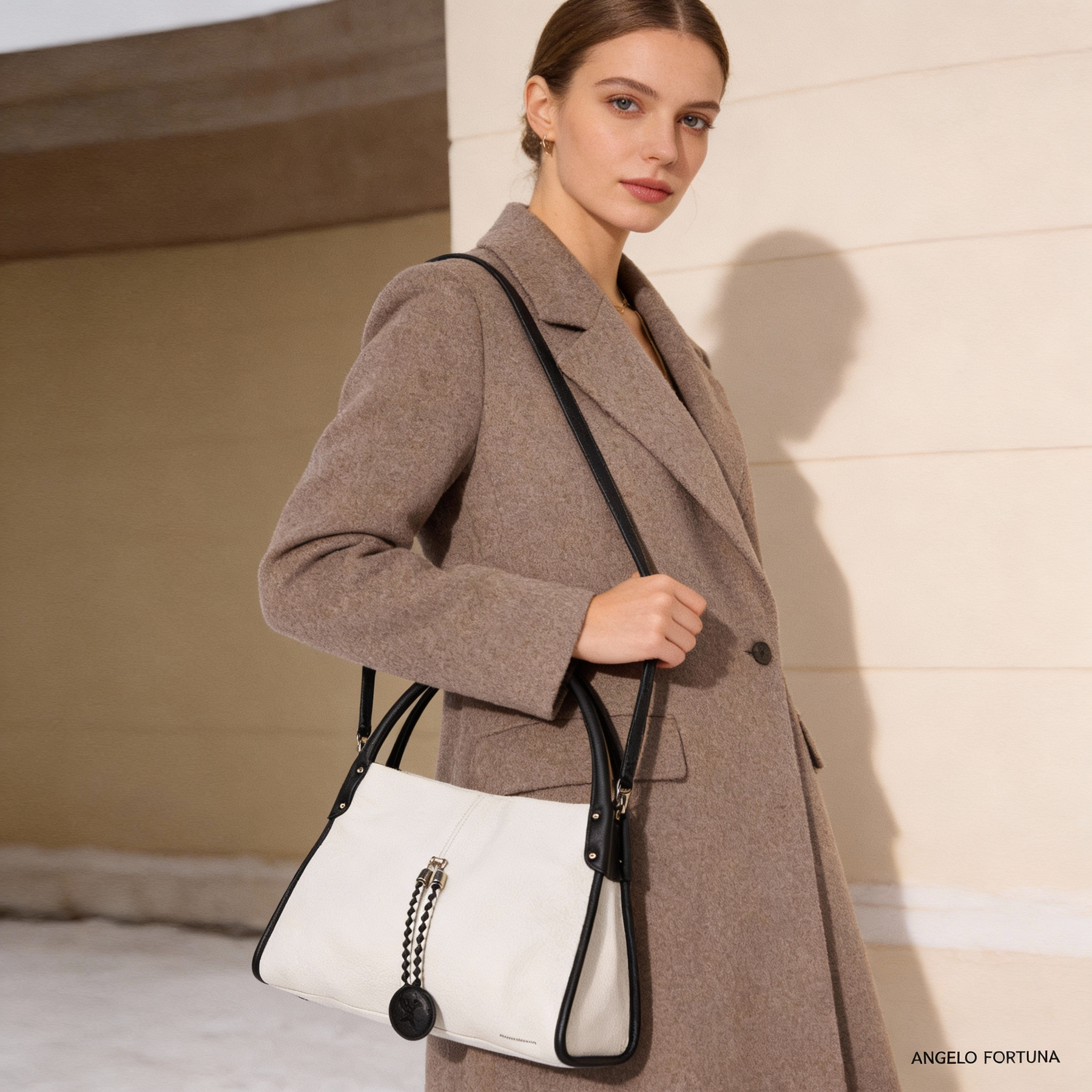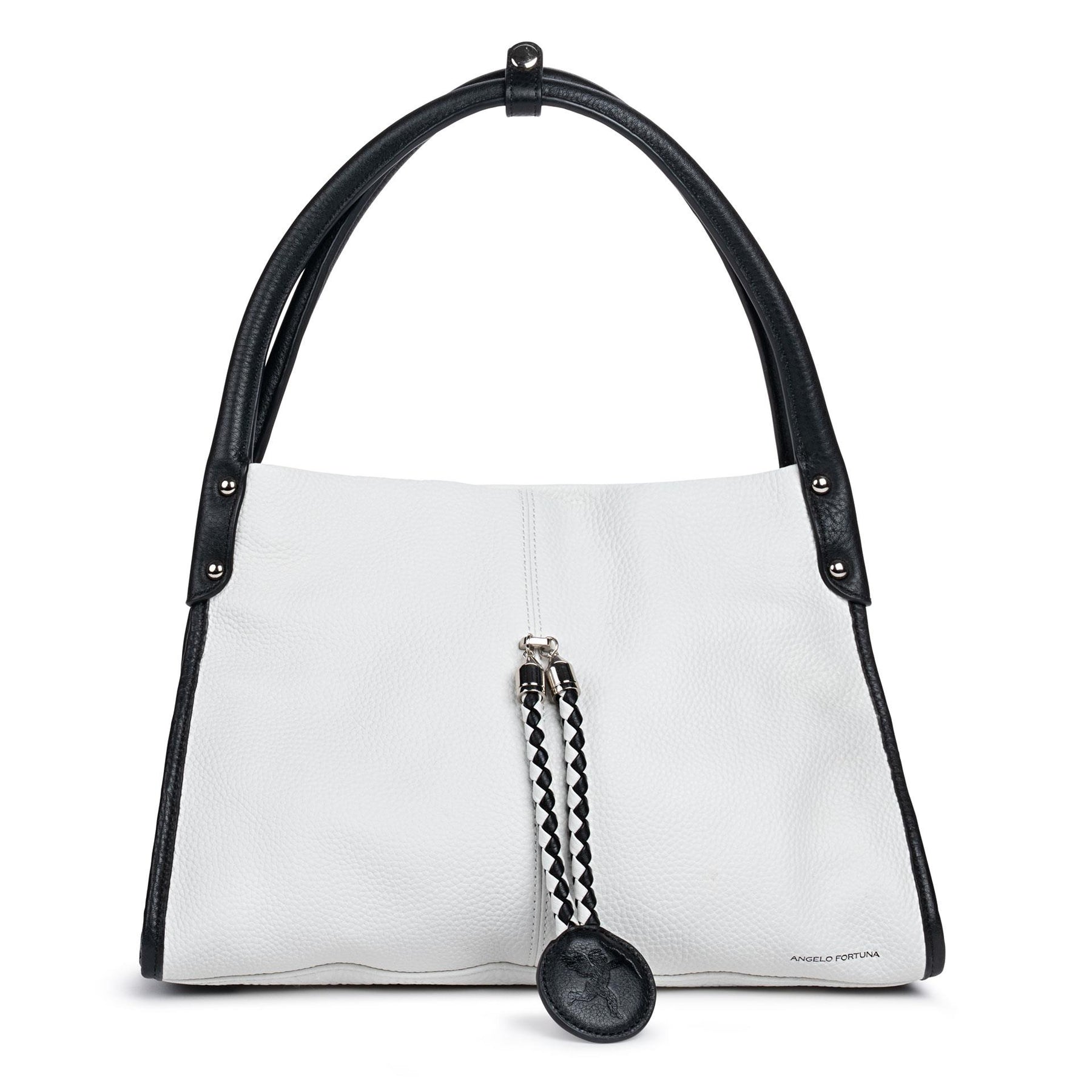 Élégant sac à bandoulière blanc en cuir de vachette souple avec des bordures noires. Nombreux rangements, 3 compartiments dont un zippé, 1 poche latérale et 1 poche extérieure zippée. Le pompon décoratif a un aimant cousu, qui peut être placé autour de l'ouverture du sac.