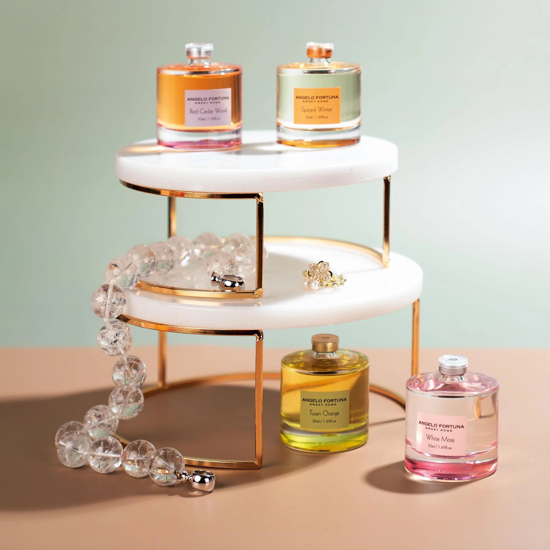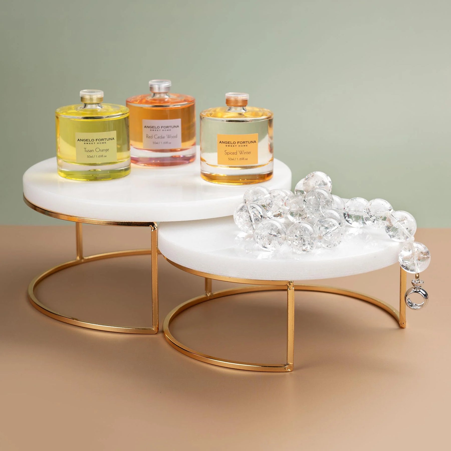 Die runden Platten aus echtem Marmor ruhen auf edlen Metallständern und lassen sich solo oder im Duo dekorieren. Der niedrige Fuss sorgt für stabilen Stand, die helle Marmoroptik passt zu jeder Deko.